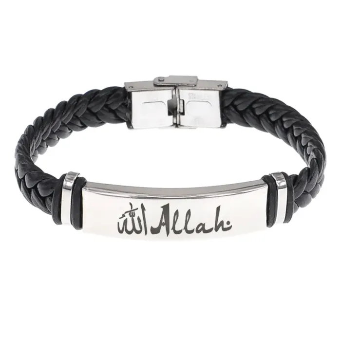 Кожаный браслет с гравировкой 'Allah'. Плетёный аксессуар из кожи и нержавеющей стали.