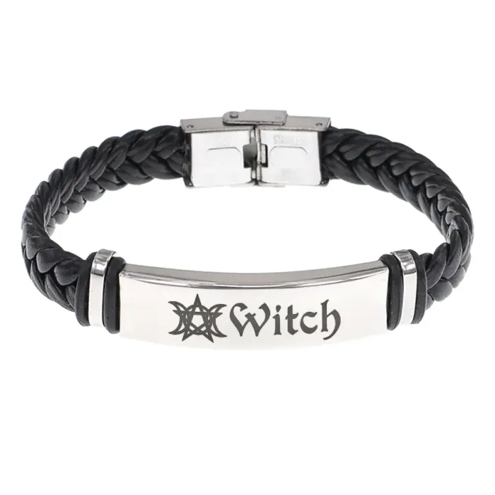 Кожаный браслет с гравировкой Witch. Плетёный аксессуар из кожи и нержавеющей стали.