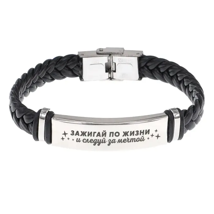 Кожаный браслет с гравировкой. Материал: кожа, нержавеющая сталь.