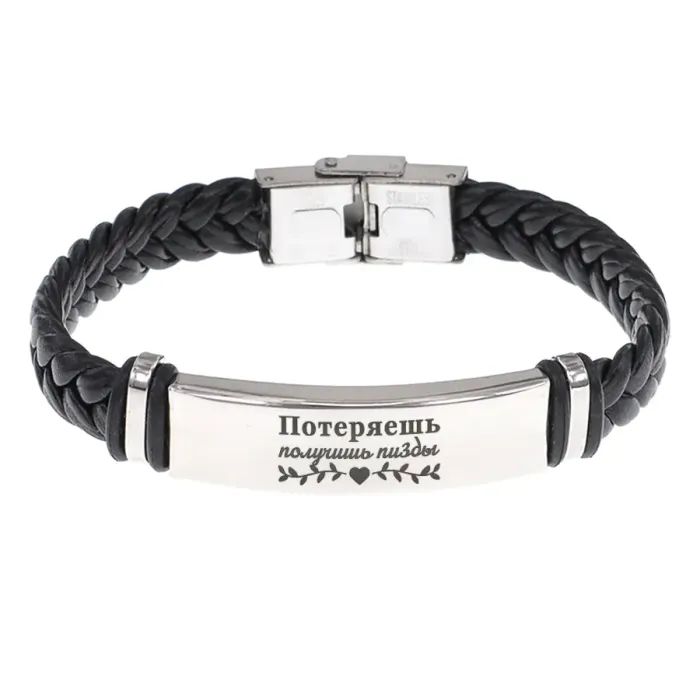 Кожаный браслет с гравировкой «Потеряешь - получишь». Плетёная конструкция.