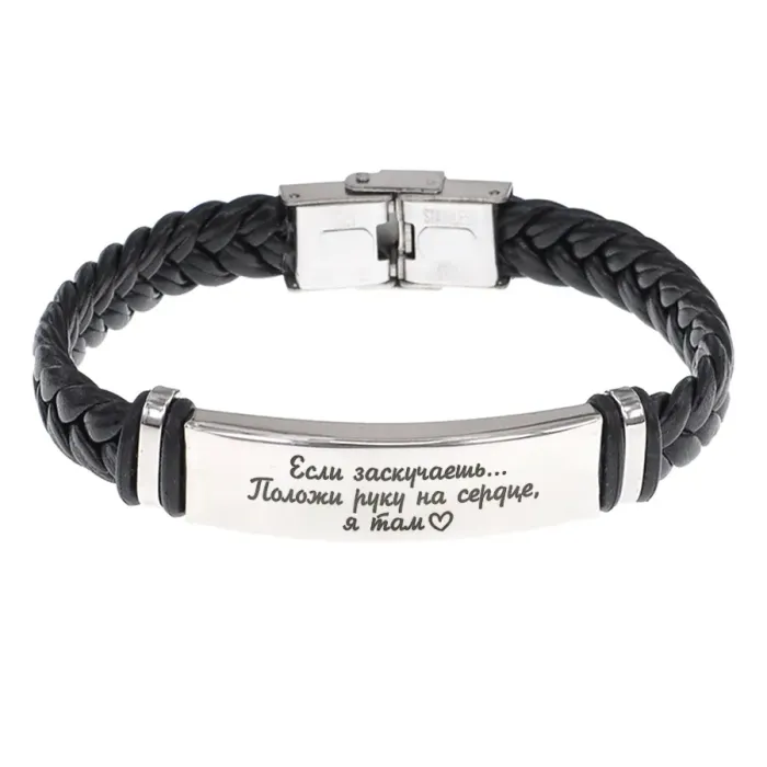 Кожаный браслет с гравировкой «Если заскучаешь». Изготовлен из кожи и нержавеющей стали.