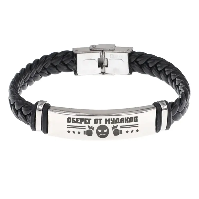 Кожаный браслет с гравировкой «Оберег от мудаков». Плетёный аксессуар из кожи и нержавеющей стали.
