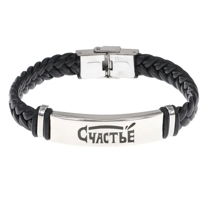 Кожаный браслет с гравировкой «Счастье». Плетёный аксессуар из кожи и нержавеющей стали.