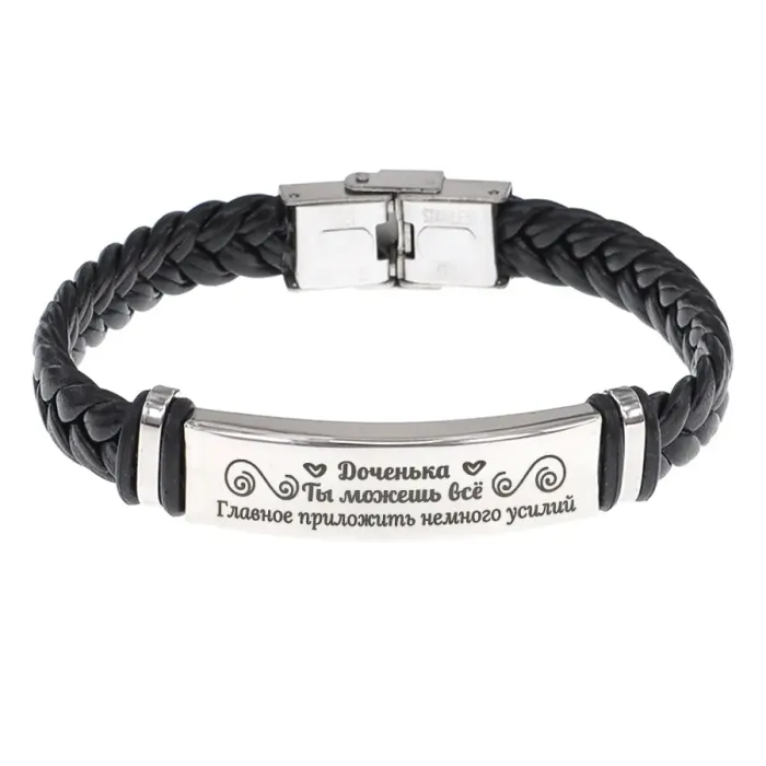 Кожаный браслет с плетёной конструкцией и гравировкой текста.