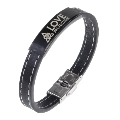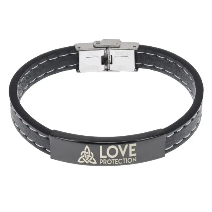 Кожаный браслет с гравировкой 'Love protection'. Изготовлен из эко-кожи и нержавеющей стали.