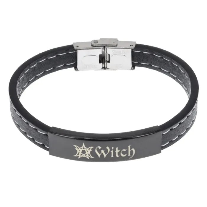 Кожаный браслет с гравировкой Witch. Сувенирный аксессуар из эко-кожи и нержавеющей стали.