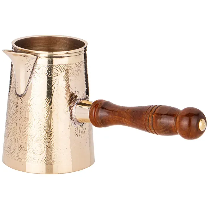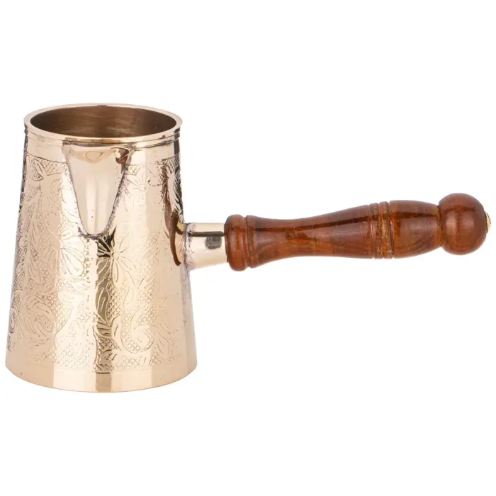 Корпус турки выполнен из латуни, материала, устойчивого к коррозии. Изделие создано с применением ручной работы, что придаёт ему уникальный характер. Конструкция оснащена съёмной ручкой из дерева, что упрощает процесс мытья.