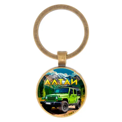 Круглый брелок из бижутерного сплава с бронзовым покрытием и стеклянной линзой.