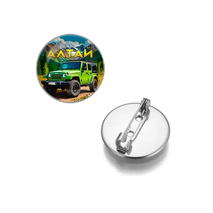 Круглый значок из бижутерного сплава с покрытием под серебро и защитной стеклянной линзой.
