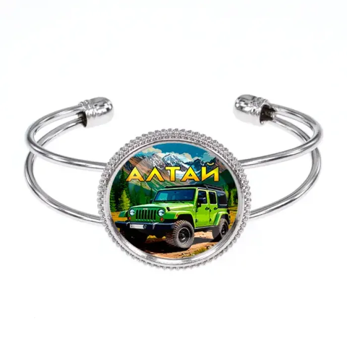 Металлический браслет в цвете серебро с центральным изображением под стеклянной линзой.