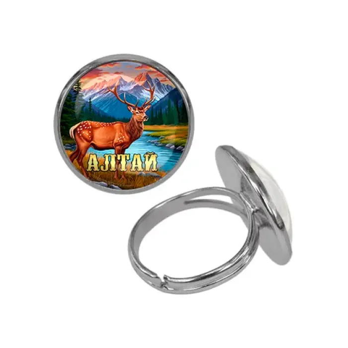 Металлическое кольцо серебристого цвета с изображением под выпуклой стеклянной линзой.
