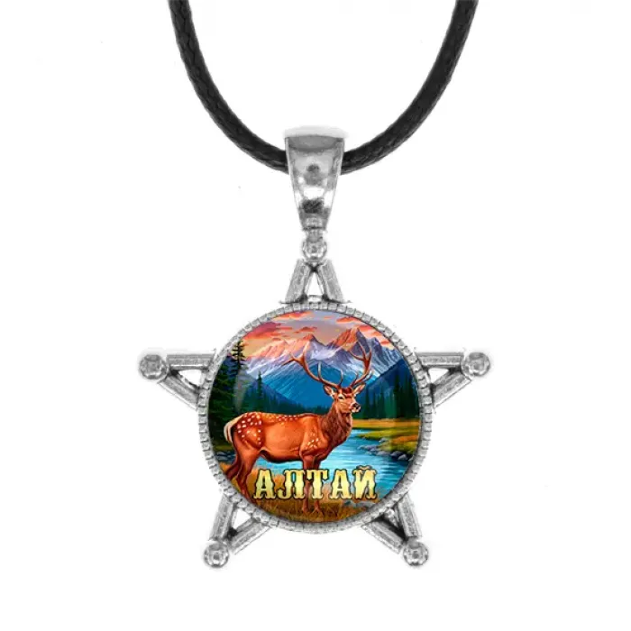 Кулон из бижутерного сплава в форме звезды с выпуклой стеклянной линзой.