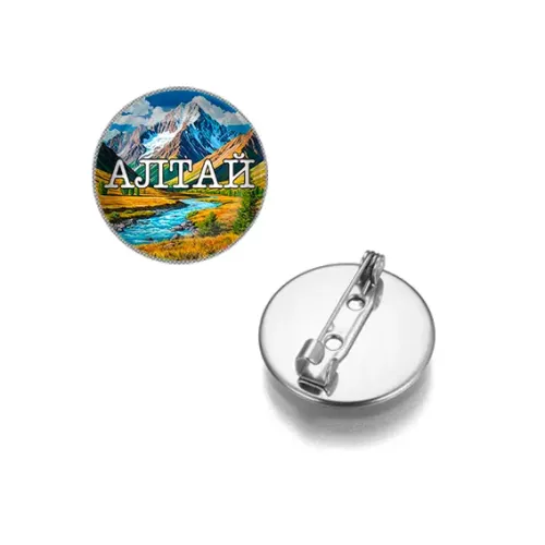 Круглый значок из бижутерного сплава в серебристом цвете с выпуклой стеклянной линзой.