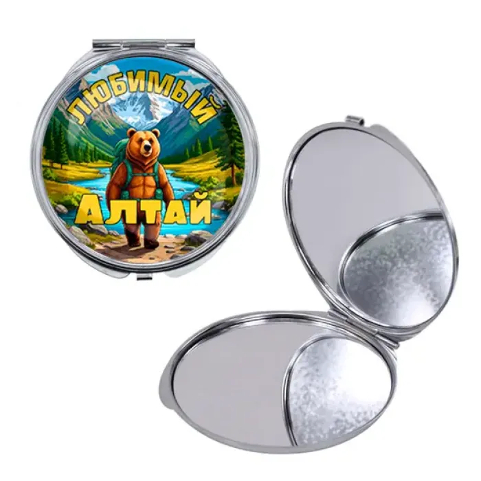Складное зеркало круглой формы из металла и стекла с полноцветным изображением на тему Алтая.