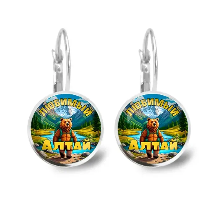 Серьги из бижутерного сплава с изображениями под выпуклыми стеклянными линзами.