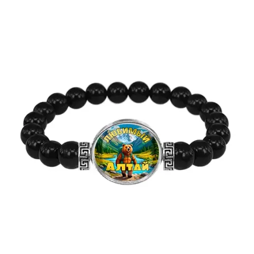 Стрейч-браслет из натурального черного агата с декоративным элементом под стеклянной линзой.