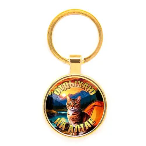 Брелок круглой формы с изображением и надписью «Отдыхаю на Алтае». Изготовлен из бижутерного сплава с золотым покрытием и стеклянной линзой.