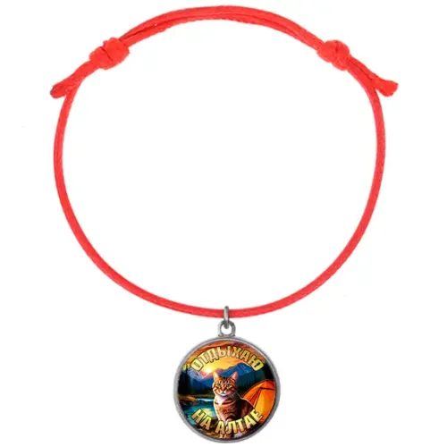 Браслет из красного шнура с металлической подвеской. На подвеске размещена полиграфическая вставка под выпуклым стеклом.