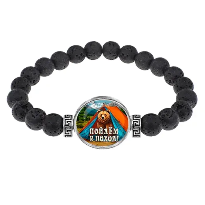 Стрейч-браслет из натуральной лавы с декоративным элементом под стеклянной линзой.