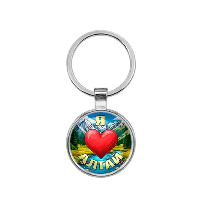 Круглый брелок-сувенир из бижутерного сплава с изображением «Я люблю Алтай».