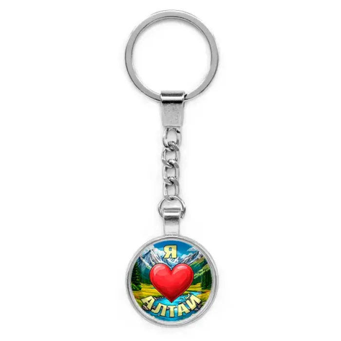 Круглый брелок-сувенир из бижутерного сплава с изображением «Я люблю Алтай».
