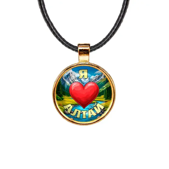 Сувенирный кулон с изображением и надписью «Я люблю Алтай». Изготовлен из бижутерного сплава с покрытием под золото и стекла.