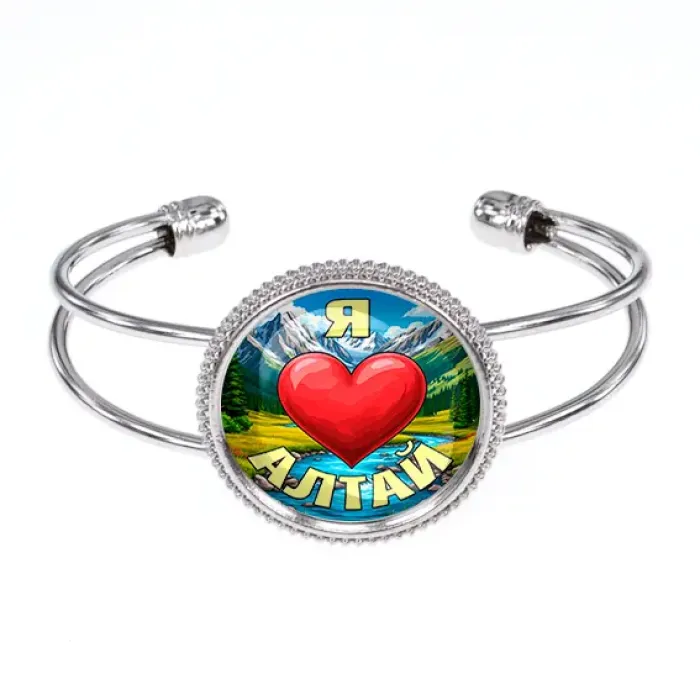 Металлический браслет с символикой «Я люблю Алтай». Основное изображение защищено выпуклой стеклянной линзой.