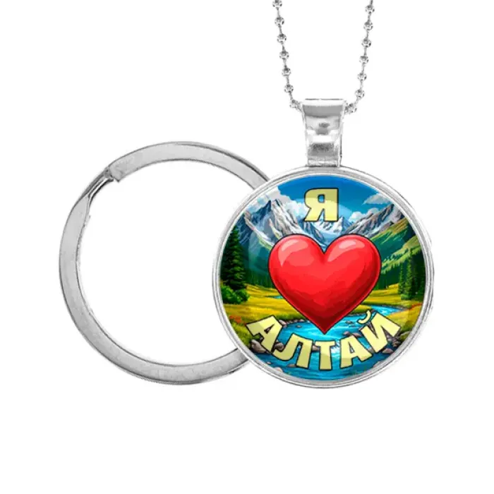 Кулон-брелок с изображением и надписью «Я люблю Алтай». Изготовлен из бижутерного сплава с серебристым покрытием и стекла.