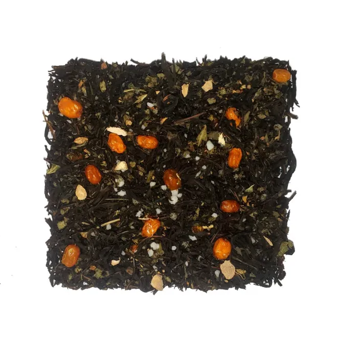Иван-чай с облепихой представляет собой напиток на основе иван-чая двойной ферментации. Его прозрачный, янтарно-золотистый настой обладает насыщенным вкусом с лёгкой терпкостью и нежной медовой сладостью. Ягодная кислинка облепихи и свежесть листа смородины гармонично дополняют композицию, а корень имбиря добавляет пикантности и тепла. Тёплый медово-облепиховый аромат завершает впечатление от напитка.