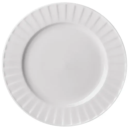 Тарелки выполнены из фарфора Fine China с добавлением искусственного минерала, что повышает их механическую прочность. Поверхность украшена рельефным декором в виде полос, клетки и точек. Классическая круглая форма с невысоким бортиком функциональна для подачи различных блюд.
