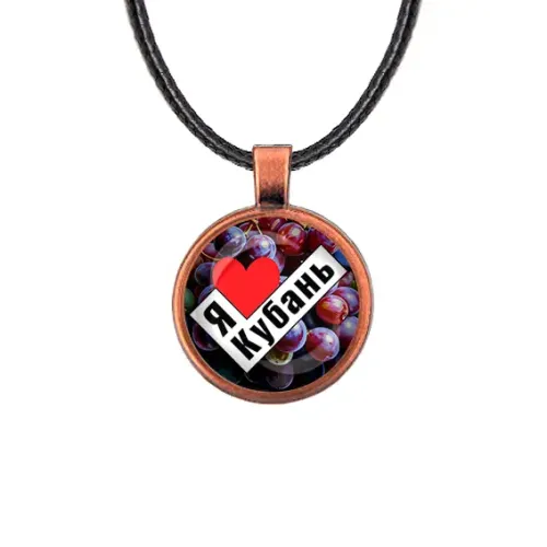 Сувенирный кулон с надписью «Я люблю Кубань» из бижутерного сплава с покрытием под медь и стеклянной линзой.
