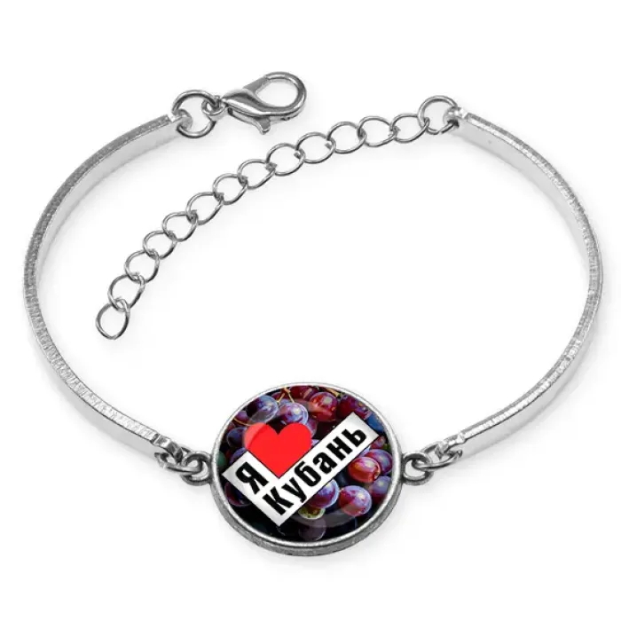 Металлический браслет-сувенир с символикой Кубани. Изготовлен из бижутерного сплава с серебристым покрытием, украшен изображением под выпуклой стеклянной линзой.