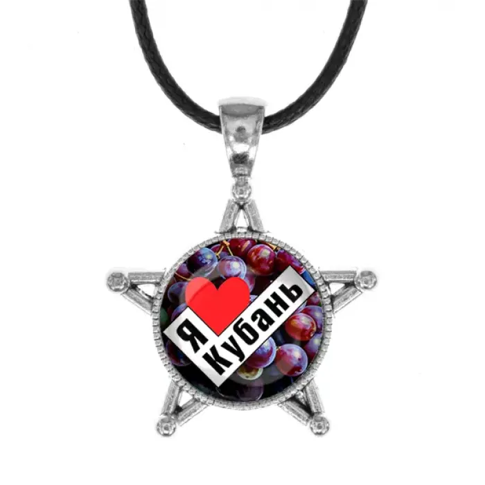 Сувенирный кулон в форме звезды с надписью «Я люблю Кубань». Изготовлен из бижутерного сплава под серебро и стекла.