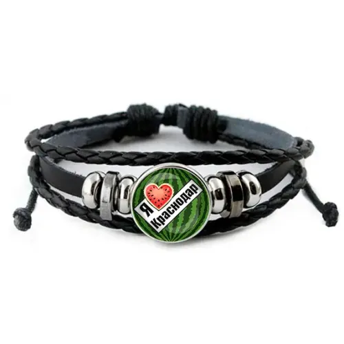 Браслет из искусственной кожи с сувенирной символикой города Краснодар. Изображение защищено выпуклой стеклянной линзой, браслет регулируется по размеру.