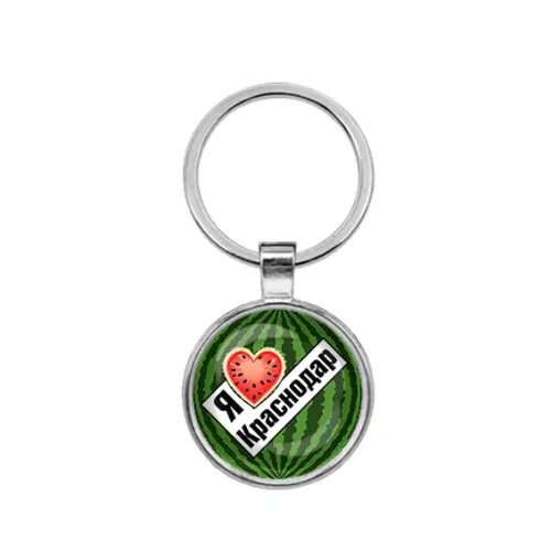 Круглый брелок с изображением «Я люблю Краснодар». Изготовлен из бижутерного сплава с серебристым покрытием и стеклянной линзой.