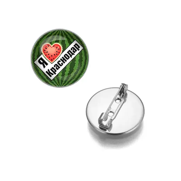 Круглый сувенирный значок из бижутерного сплава с надписью 'Я люблю Краснодар'.