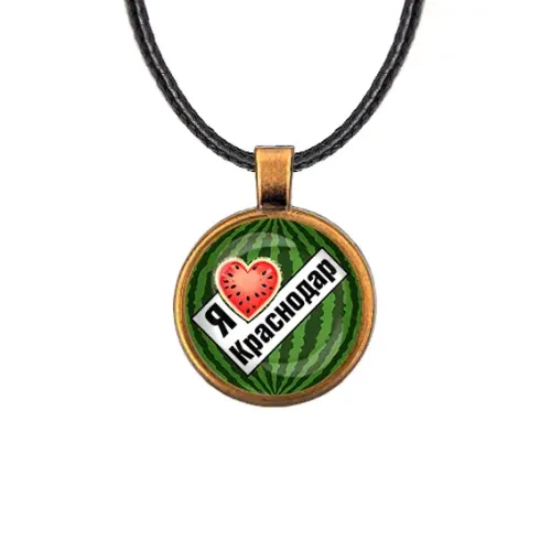 Сувенирный кулон с изображением и надписью «Я люблю Краснодар». Изготовлен из бижутерного сплава со стеклянной линзой.