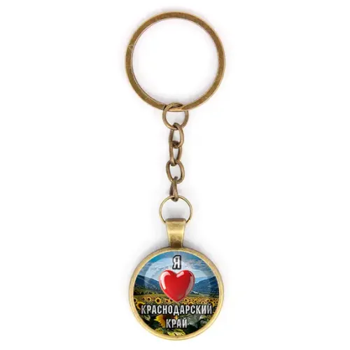Брелок сувенирный круглой формы с изображением и надписью «Я люблю Краснодарский край». Изготовлен из бижутерного сплава с бронзовым покрытием и стеклянной линзой.