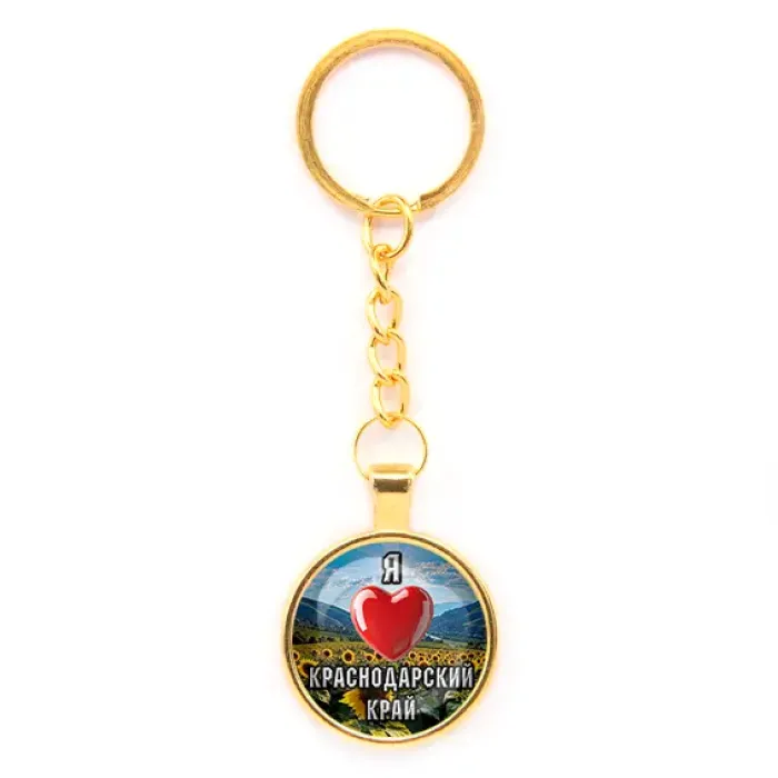 Круглый брелок для ключей из бижутерного сплава с позолоченным покрытием и стеклянной линзой, с изображением надписи «Я люблю Краснодарский край».