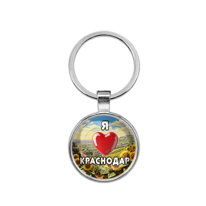 Круглый брелок из бижутерного сплава с надписью «Я люблю Краснодар».