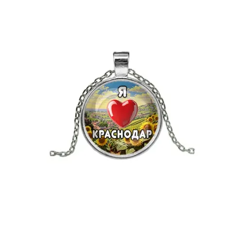 Сувенирный кулон с символикой города Краснодар. Изготовлен из бижутерного сплава с серебристым покрытием и стеклянной линзой.