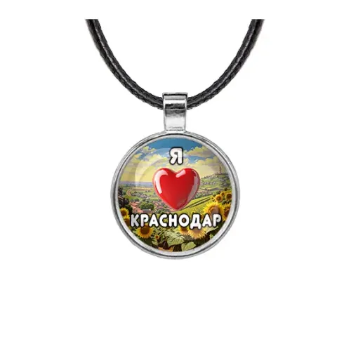Сувенирный кулон с изображением и надписью «Я люблю Краснодар». Изготовлен из бижутерного сплава со стеклянной линзой.