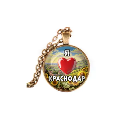 Сувенирный кулон с символикой города Краснодар. Изготовлен из бижутерного сплава с бронзовым покрытием и стеклянной линзой.