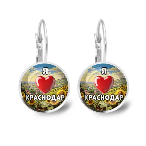 Серьги сувенирные из бижутерного сплава с изображением города Краснодар под выпуклыми стеклянными линзами.