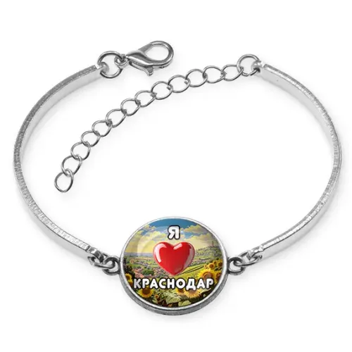 Браслет с сувенирной символикой «Я люблю Краснодар». Изготовлен из бижутерного сплава с серебристым покрытием, имеет безразмерную конструкцию.