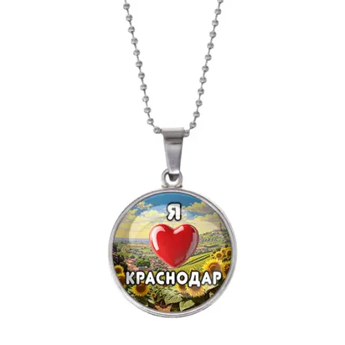 Сувенирный кулон с надписью «Я люблю Краснодар». Изготовлен из бижутерного сплава с серебристым покрытием и стекла.