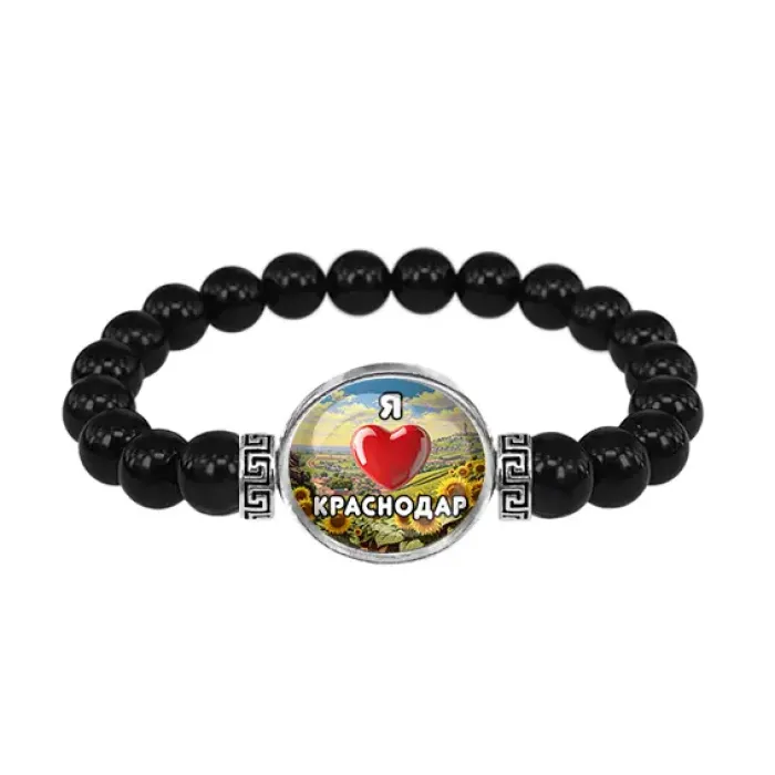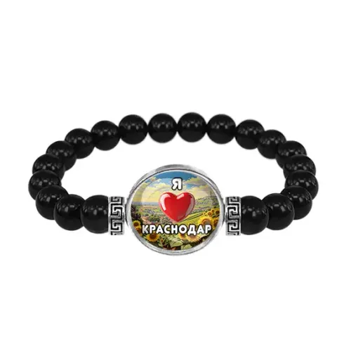 Стрейч-браслет из натурального черного агата с декоративным элементом «Я люблю Краснодар» под стеклянной линзой.