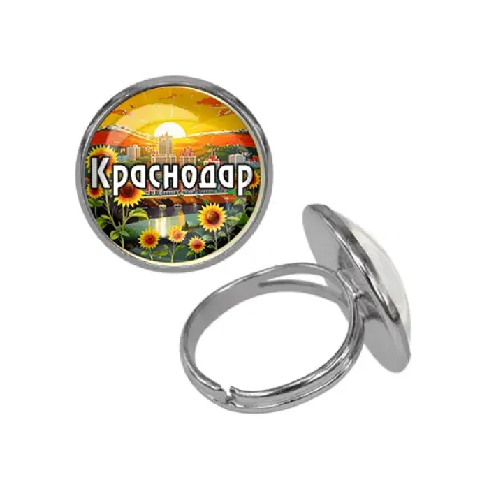 Сувенирное кольцо из бижутерного сплава с покрытием под серебро и выпуклой стеклянной линзой.