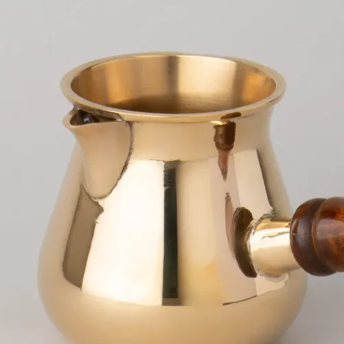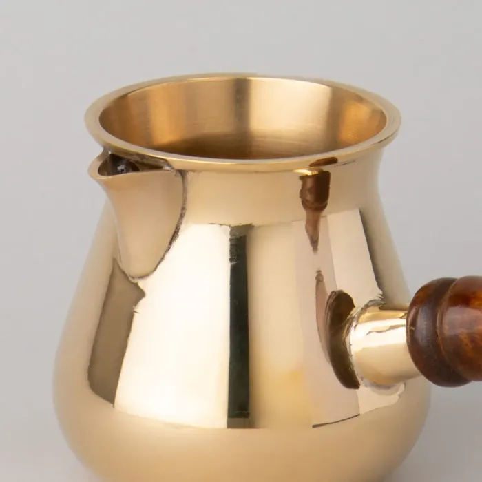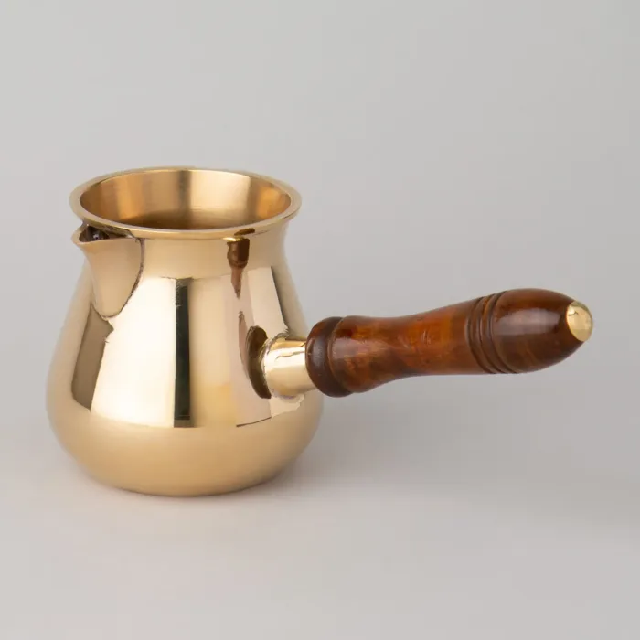 Корпус турки изготовлен из латуни — материала, устойчивого к коррозии. Декор нанесён вручную методом чеканки и росписи, что обеспечивает уникальность каждого экземпляра. Конструкция включает съёмную ручку из дерева, что облегчает уход и хранение изделия.