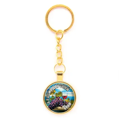 Круглый брелок-сувенир с изображением Краснодарского края, выполненный из бижутерного сплава с золотым покрытием и стеклянной линзой.